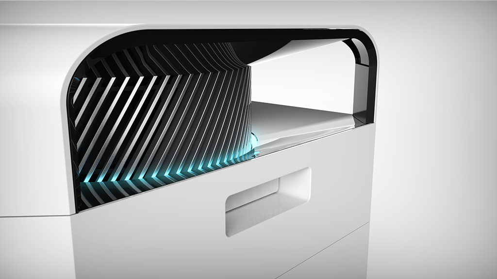 該產(chǎn)品底部進風,風機置頂,空氣流經(jīng)層層濾網(wǎng),由頂部的風機將潔凈的空氣向四個方向噴出,合理的結(jié)構(gòu)保證了盡可能大的濾網(wǎng)有效橫截面積,減少空氣流經(jīng)路徑的轉(zhuǎn)向?qū)艋芰淼挠绊憽A硗饪諝鈨艋魈峁┝怂膶游恢冒惭b濾網(wǎng),可靈活自定義,根據(jù)自身需求靈活選擇濾網(wǎng)組合。同時還創(chuàng)新性地提供了多款專效濾網(wǎng),針對甲醛、細菌、煙味等,專注于解決不同使用環(huán)境中用戶的痛點,滿足每一個用戶對潔凈空氣的需求。設(shè)計概念重點表現(xiàn)未來感及科技感,電機防護罩周圍的隱藏式燈帶可直觀的反映出室內(nèi)的空氣質(zhì)量情況,是整個設(shè)計的點睛之筆。設(shè)計語言在保持硬朗高效率寓意的前提下也進行了去邊角處理,增加產(chǎn)品的友好性。色彩材質(zhì)方面以代表潔凈的白色為主色調(diào),電機罩部分以銀色寓意功能強大,中間以黑色進行過度和增加對比。體現(xiàn)出外表極致簡潔,功能極其強大的核心理念。