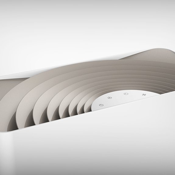 整體的設(shè)計概念大多取自自然的元素,增加了工業(yè)產(chǎn)品的人情味。材質(zhì)的選用和搭配簡潔明了,不突兀,更容易融入各種使用環(huán)境。出風(fēng)口的設(shè)計抽象于安靜水面上泛起的一絲漣漪,擴(kuò)散的語言也符合出風(fēng)的寓意。機(jī)器背面的進(jìn)風(fēng)口的設(shè)計在符合整體有機(jī)、自然的風(fēng)格下也加強(qiáng)了進(jìn)風(fēng)的產(chǎn)品語義。整體設(shè)計在平面的外表下又具備一些充滿靈氣的細(xì)節(jié)。